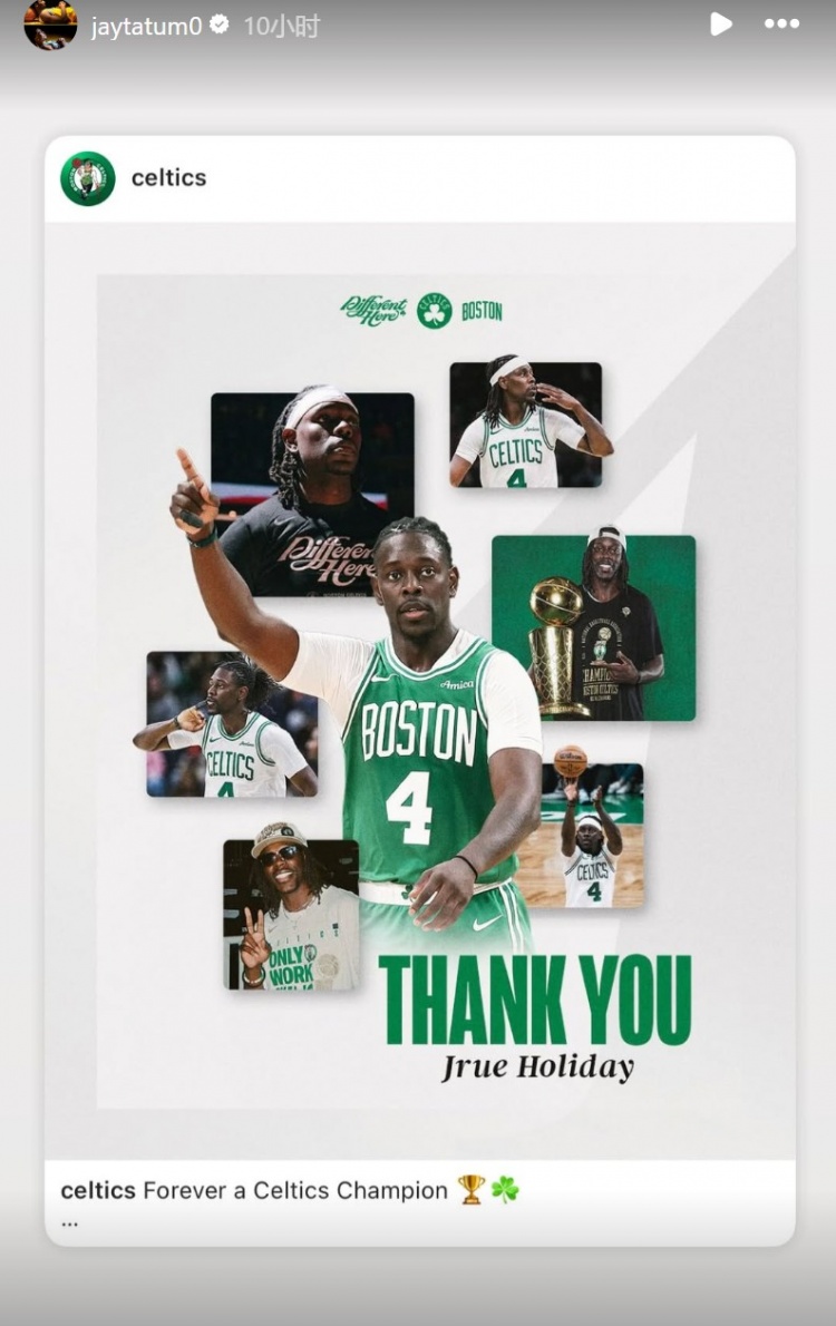 凯尔特人球星杰森-塔图姆在INS转发报道向他们告别。